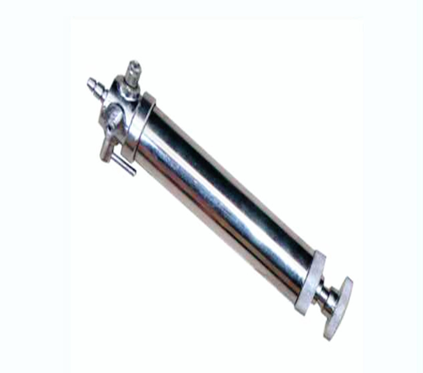主要由三通閥門、進(jìn)氣口、出氣口、膠塞閥、拉桿、活塞、氣筒及密封圈等部件組成。